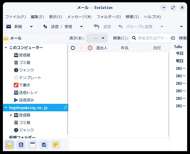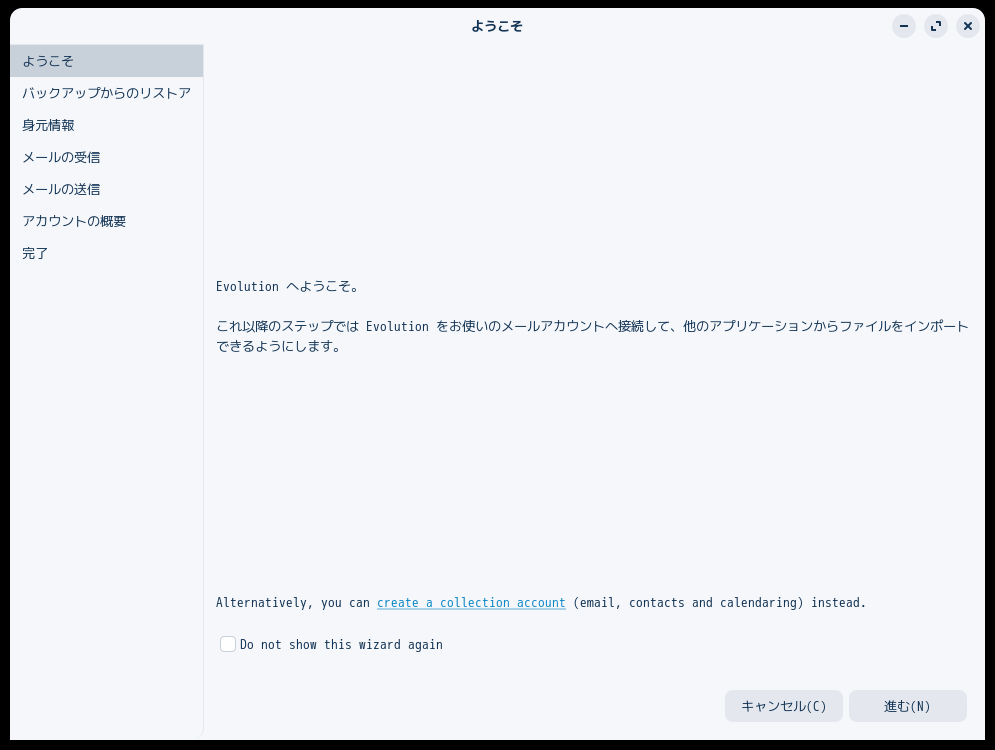 初回起動時は「ようこそ」が起動します。 起動直後の状態です。 2024年9月26日の時点で、下記のバージョンでした。 操作方法等は、「メール クライアント ソフト - Evolution」をご参照ください。 |