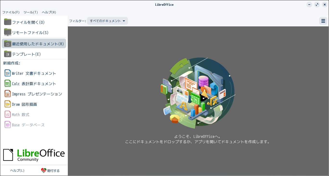 起動直後の状態です。 2024年9月26日の時点で、下記のバージョンでした。 操作方法等については「オフィススィート LibreOffice」をご参照ください。 |
