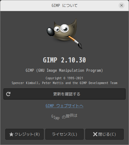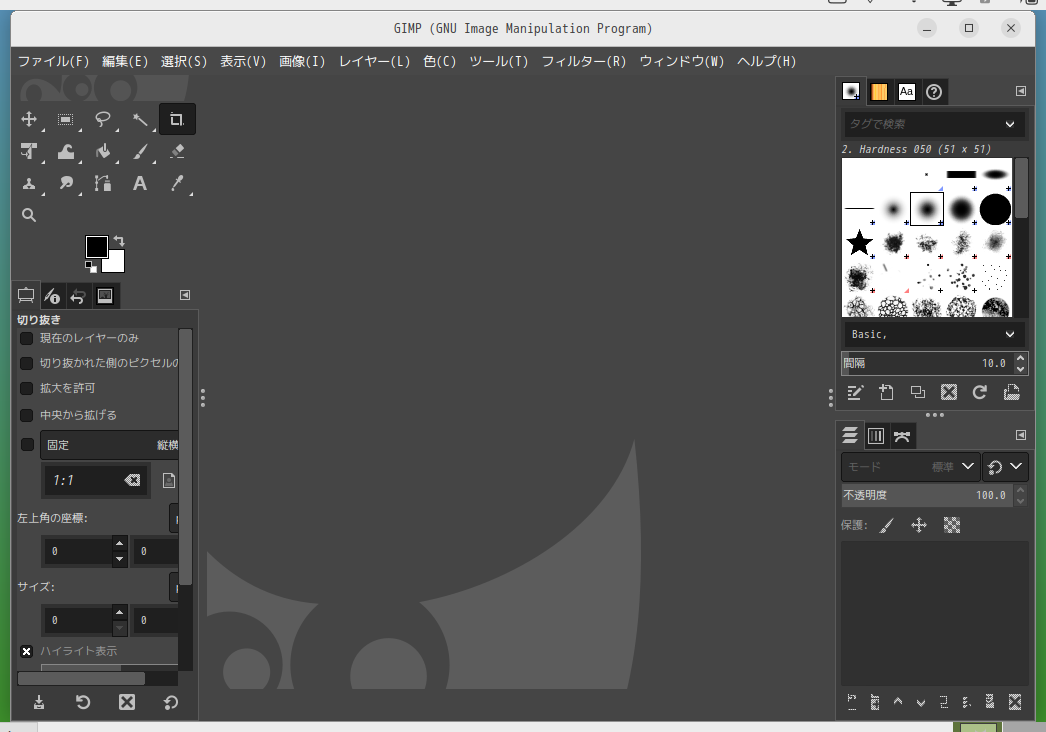起動直後の状態です。 2024年9月30日の時点で、下記のバージョンでした。 操作については、「画像編集ソフト GIMP2」に掲載しています。 上記は簡単なものですので、詳細なものがほしい方は、各所に初歩の手引きから応用編までありますので、そちらを参考にしてください。 |