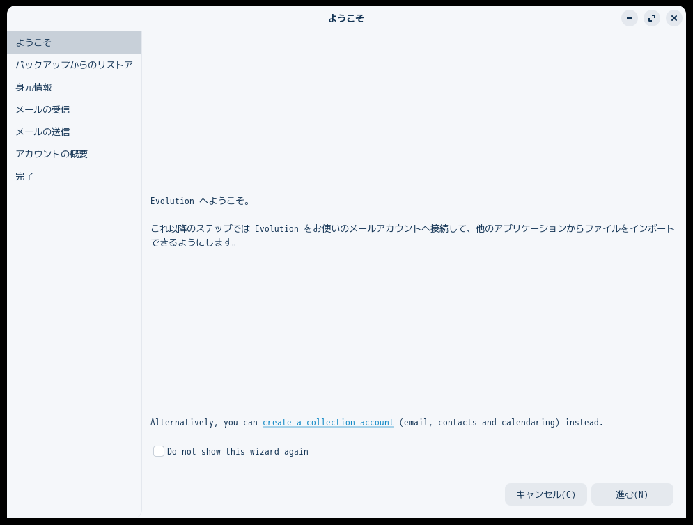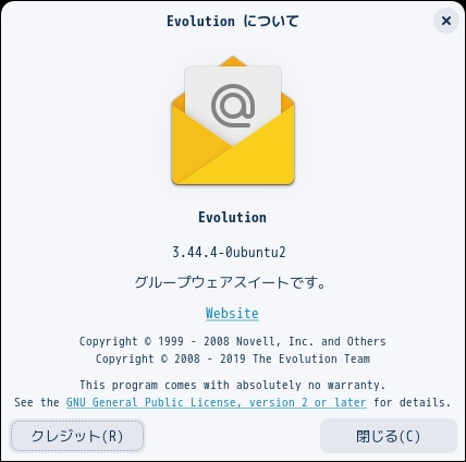 初回起動時は「ようこそ」が起動します。 起動直後の状態です。 2025年3月27日の時点で、下記のバージョンでした。 操作方法等は、「メール クライアント ソフト - Evolution」をご参照ください。 |