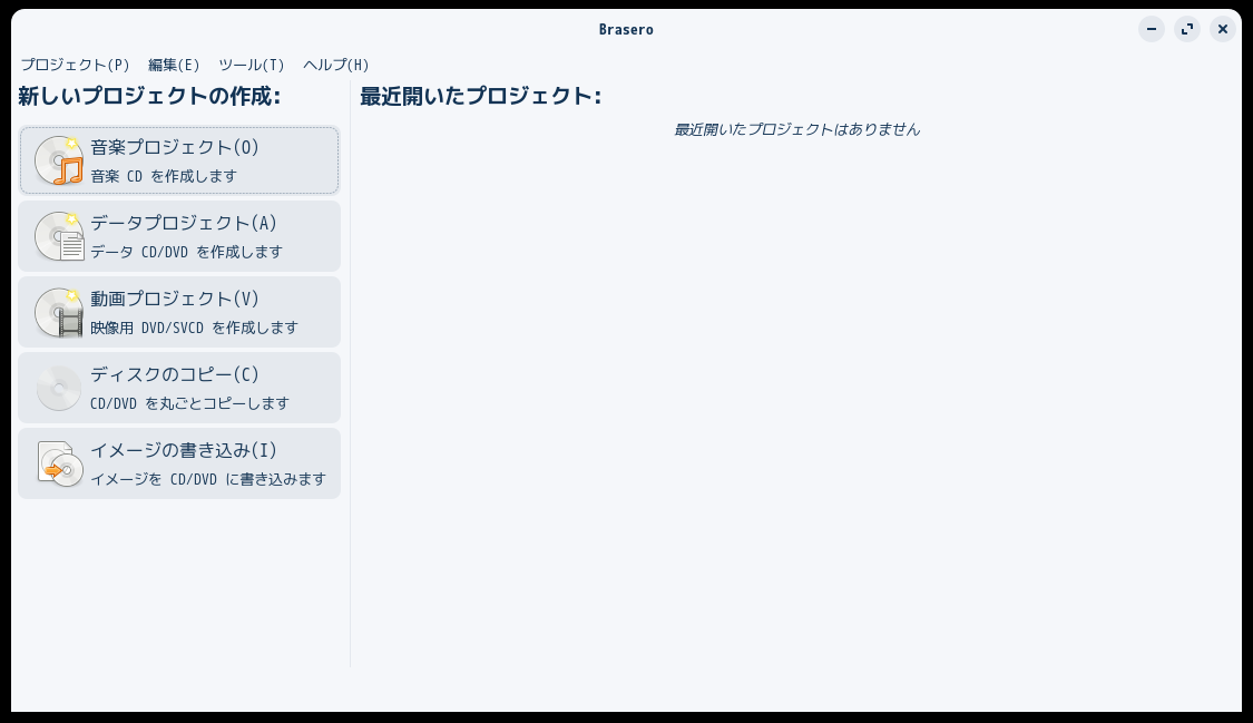 1. 概要 光ディスクライティングソフトとして、「Brasero」を使用します。 「Brasero」は、デフォルトでインストールされています。 2. 起動 「スタート」→「B」→「Brasero」