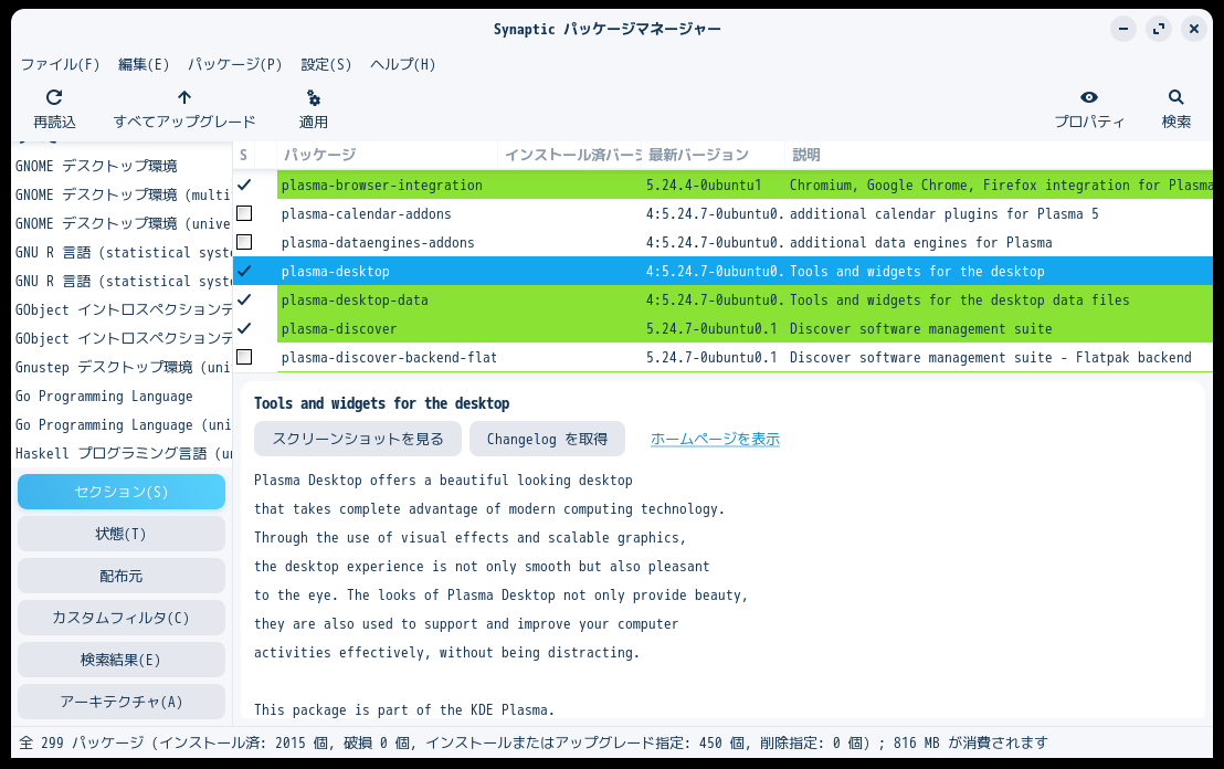 別途、「konsole」を検索して、インストールします。 インストールが終わったら、再起動します。 再起動後、ログイン画面で、「Plasma(X11)」を選択すると、「KDE」のデスクトップへログインできます。 |