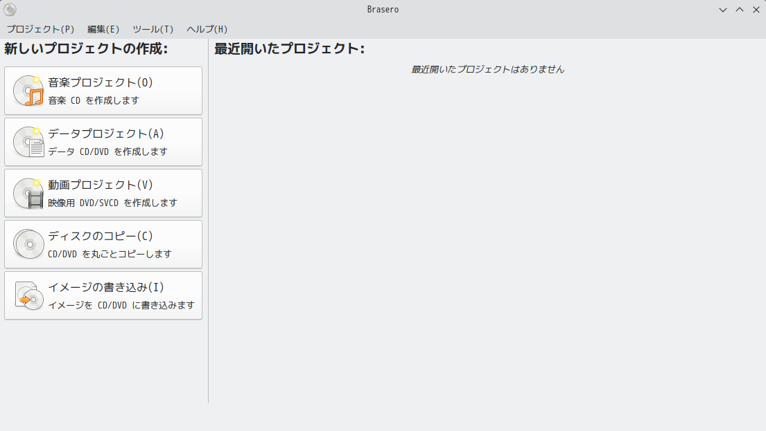 1. 概要 光ディスクライティングソフトとして、「Brasero」を使用します。 「Brasero」は、デフォルトでインストールされています。 2. 起動 「スタート」→「マルチメディア」→「Brasero」