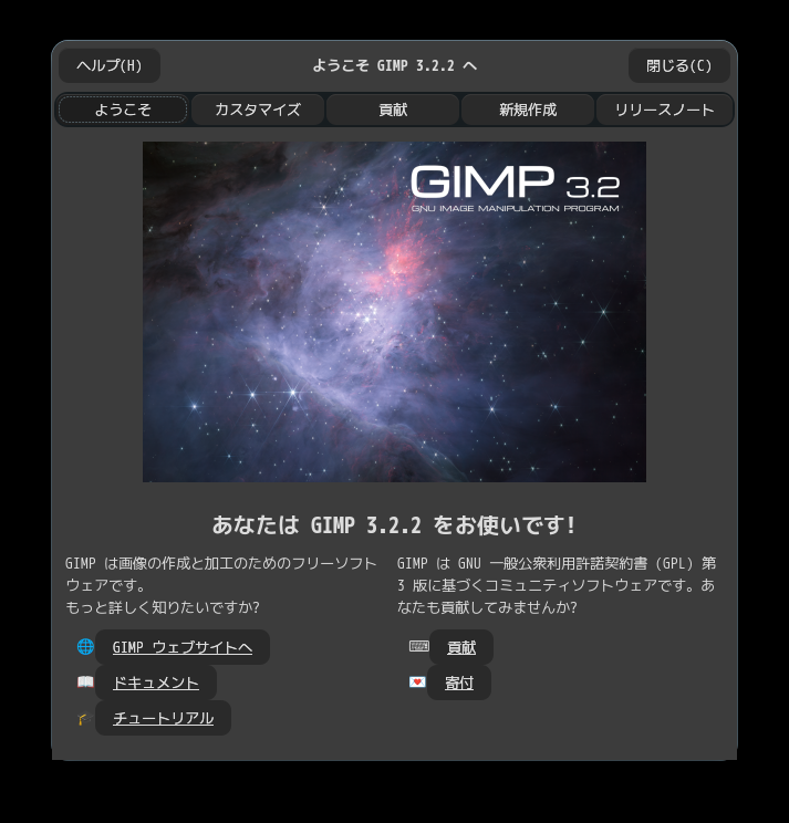 起動直後の状態です。 前回は、日本語化されていませんでしたが、今回は、日本語化されています。
