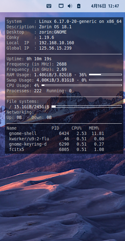ログイン後に、デスクトップ右に、「Conky」の表示が現れます。