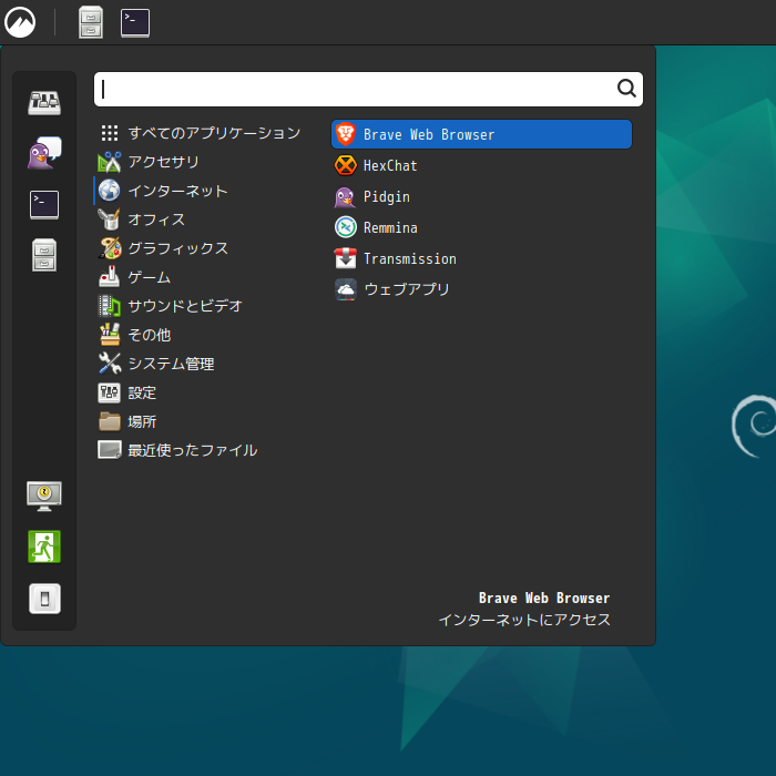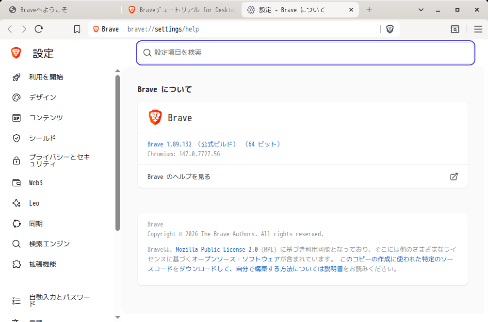 1. 概要 ブラウザとして、「Brave」がデフォルトでインストールされ、日本語化されています。 2. 起動 「スタート」→「インターネット」→「Brave Web Browser」