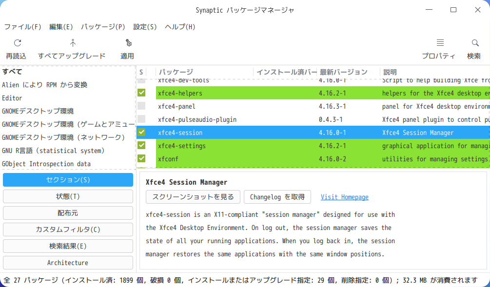 「xfce4-session」「xfce4-clipman」「xfce4-panel」をインストールします。