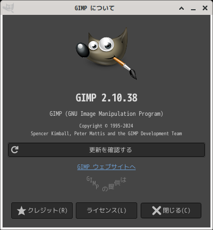 起動直後の状態です。 2024年8月20日の時点で、下記のバージョンでした。 操作については、「画像編集ソフト GIMP2」に掲載しています。 上記は簡単なものですので、詳細なものがほしい方は、各所に初歩の手引きから応用編までありますので、そちらを参考にしてください。 |
