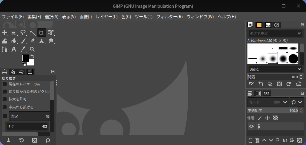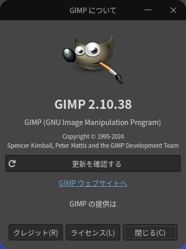 起動直後の状態です。 2025年4月22日の時点で、下記のバージョンでした。 操作については、「画像編集ソフト GIMP2」に掲載しています。 上記は簡単なものですので、詳細なものがほしい方は、各所に初歩の手引きから応用編までありますので、そちらを参考にしてください。 |