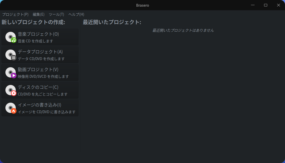 1. 概要 光ディスクライティングソフトとして、「Brasero」を使用します。 2. インストール 「Synaptic」で、「brasero」を検索して、インストールします。 3. 起動 「スタート」→「ビデオ」→「Brasero」