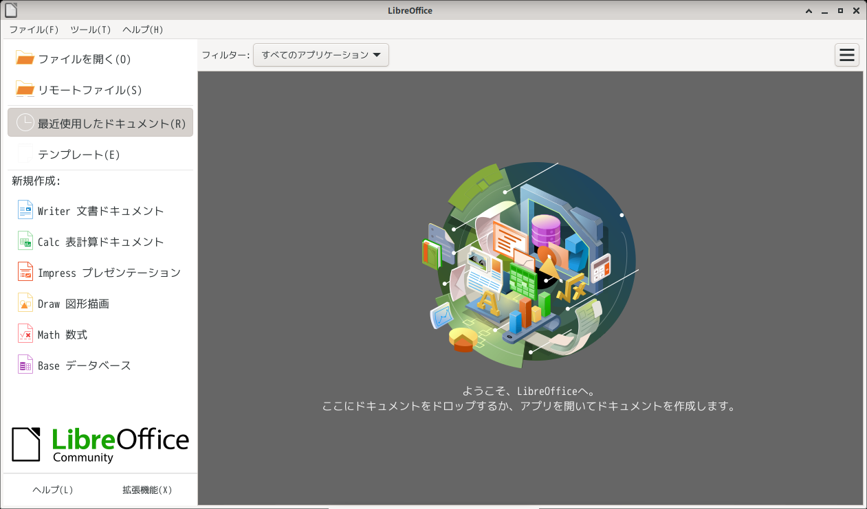 1. 概要 オフィススイートとして「LibreOffice」がインストールされています。 今まで、日本語化されていなくて、日本語化モジュールをインストールしていましたが、今回は、この時点で、日本語化されていました。 2. 起動 「スタート」→「オフィス」→ 「LibreOffice」