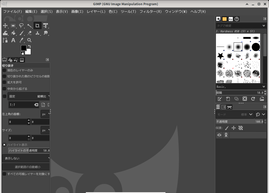 起動直後の状態です。 2025年4月23日の時点で、下記のバージョンでした。 操作については、「画像編集ソフト GIMP」に掲載しています。 上記は簡単なものですので、詳細なものがほしい方は、各所に初歩の手引きから応用編までありますので、そちらを参考にしてください。 |