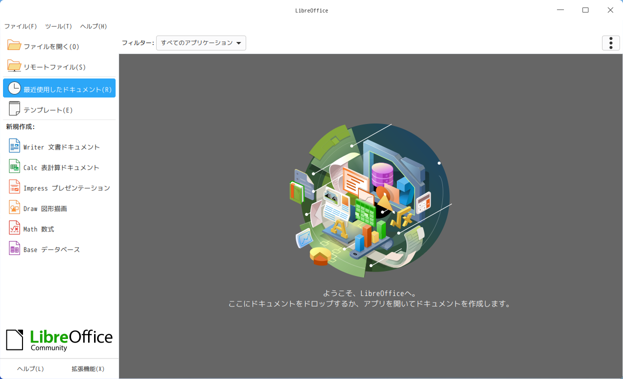 1. 概要 オフィススイートとして「LibreOffice」がインストールされ、日本語化されています。 2. 起動 「スタート」→「オフィス」→「LibreOffice」