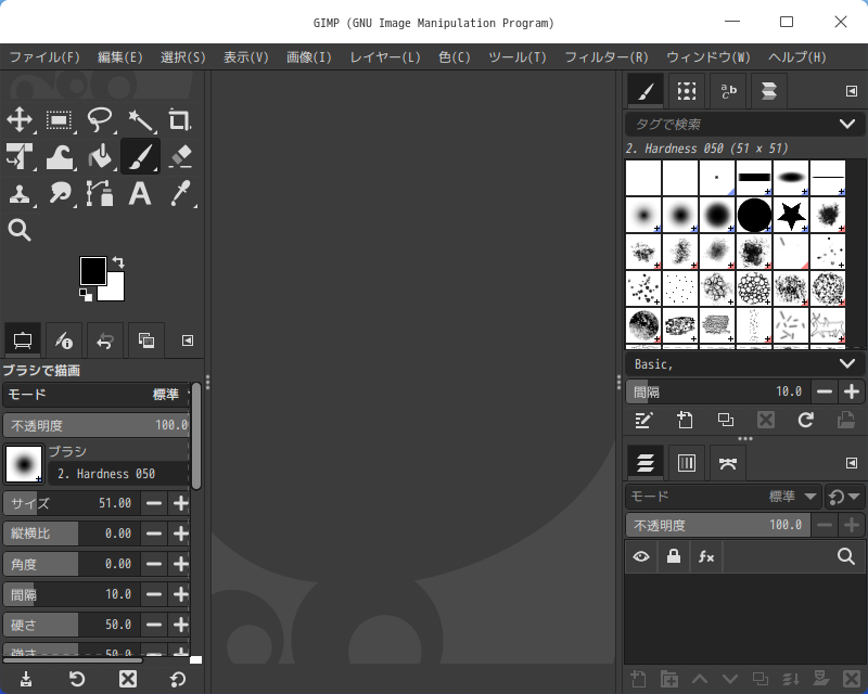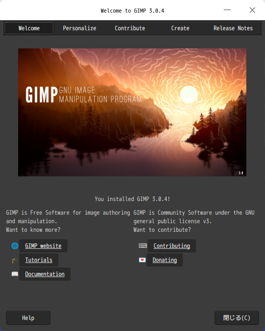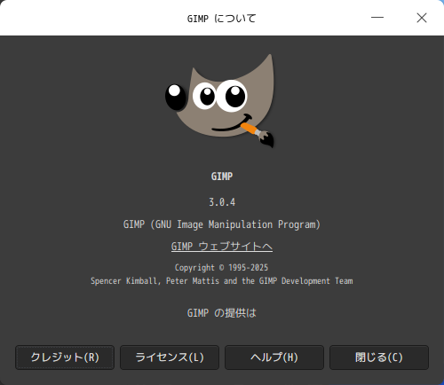 「閉じる」 起動直後の状態です。 2025年6月30日の時点で、下記のバージョンでした。 操作については、「画像編集ソフト GIMP」に掲載しています。 上記は簡単なものですので、詳細なものがほしい方は、各所に初歩の手引きから応用編までありますので、そちらを参考にしてください。 |