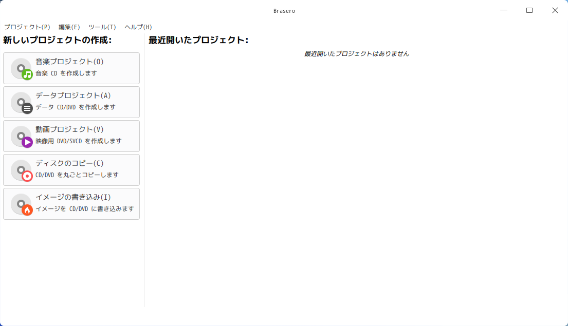 1. 概要 光ディスクライティングソフトとして、「Brasero」を使用します。 2. インストール 「Synaptic」で、「brasero」を検索して、インストールします。 3. 起動 「スタート」→「ビデオ」→「Brasero」