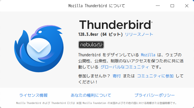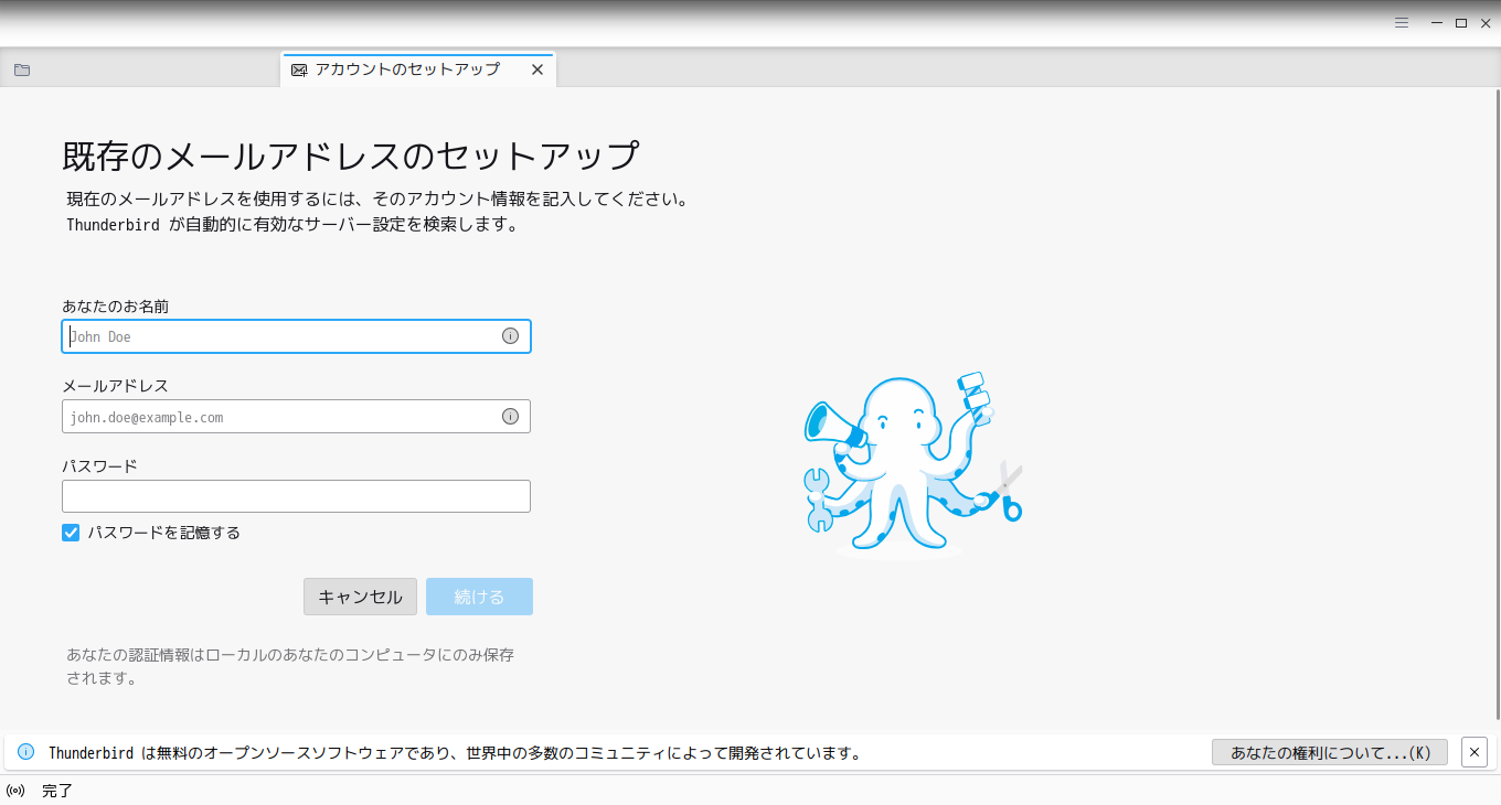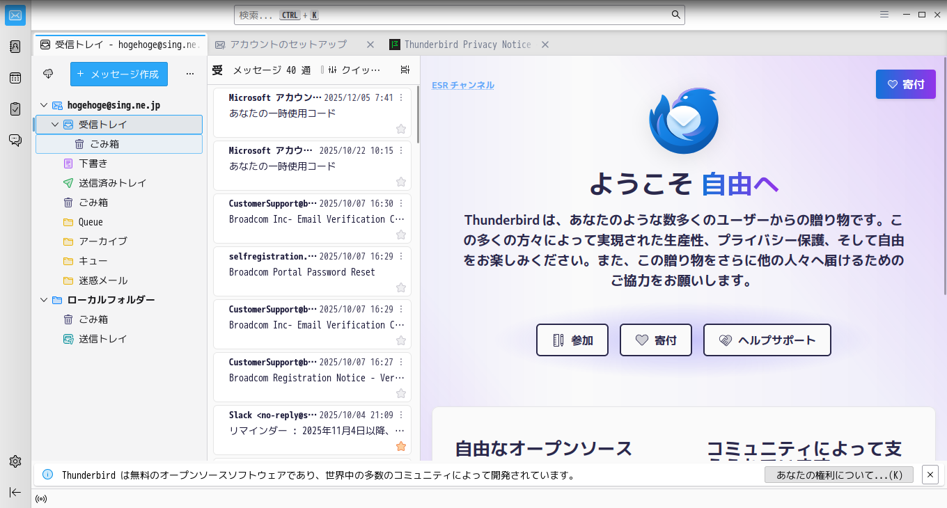初回起動時は「メールアカウント設定」が起動します。 起動直後の状態です。 2026年1月22日の時点で、下記のバージョンでした。 アカウントの設定や操作に関しては、「メール クライアント ソフト - Thunderbird」をご参照ください。 |