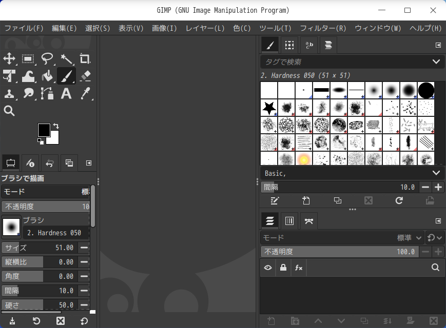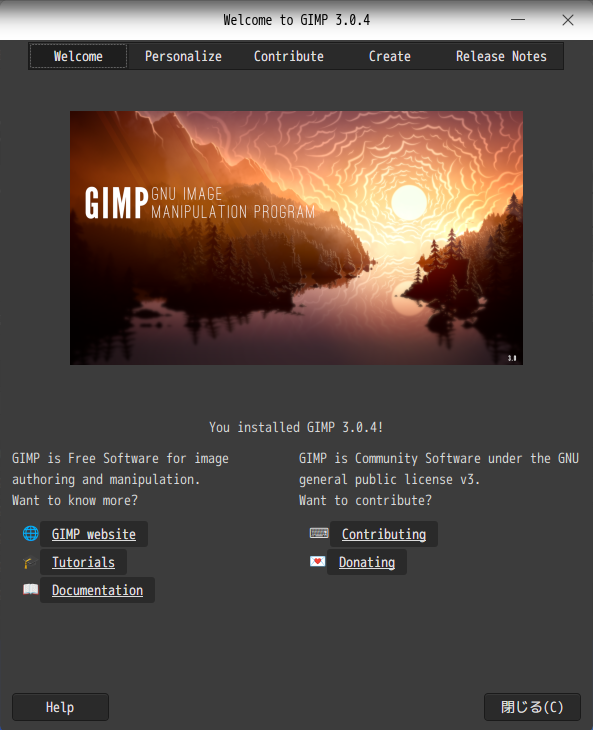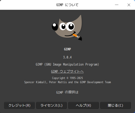 「閉じる」 起動直後の状態です。 2026年1月23日の時点で、下記のバージョンでした。 操作については、「画像編集ソフト - GIMP」に掲載しています。 上記は簡単なものですので、詳細なものがほしい方は、各所に初歩の手引きから応用編までありますので、そちらを参考にしてください。 |