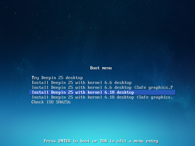 「Install Deepin 25 with kernel 6.18 Desktop」を選択して。