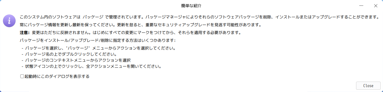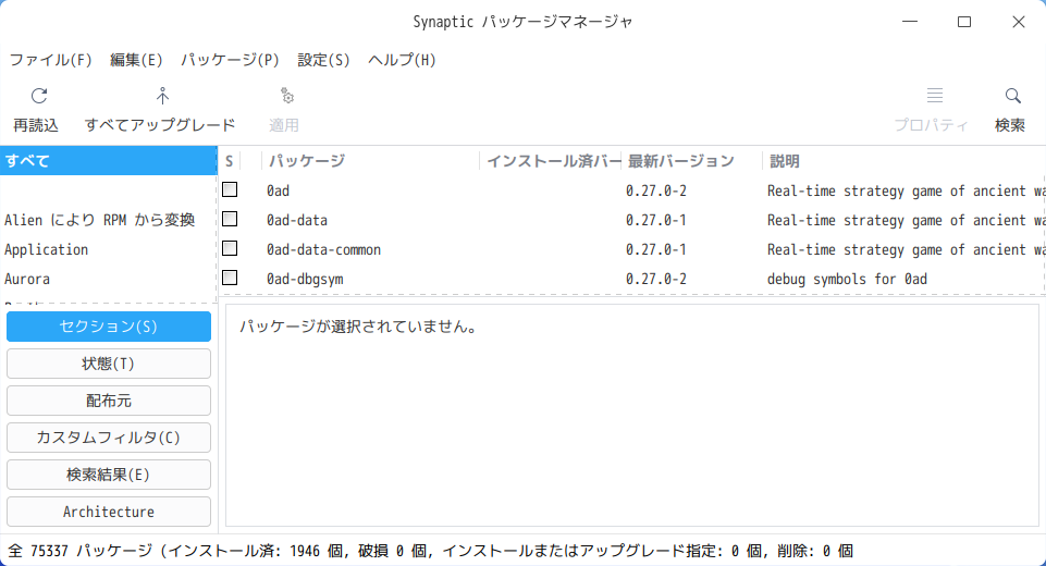 ただし、わたしには少々使いにくいので、メインのパッケージ管理フロントエンドとして「Synaptic」を使用します。
