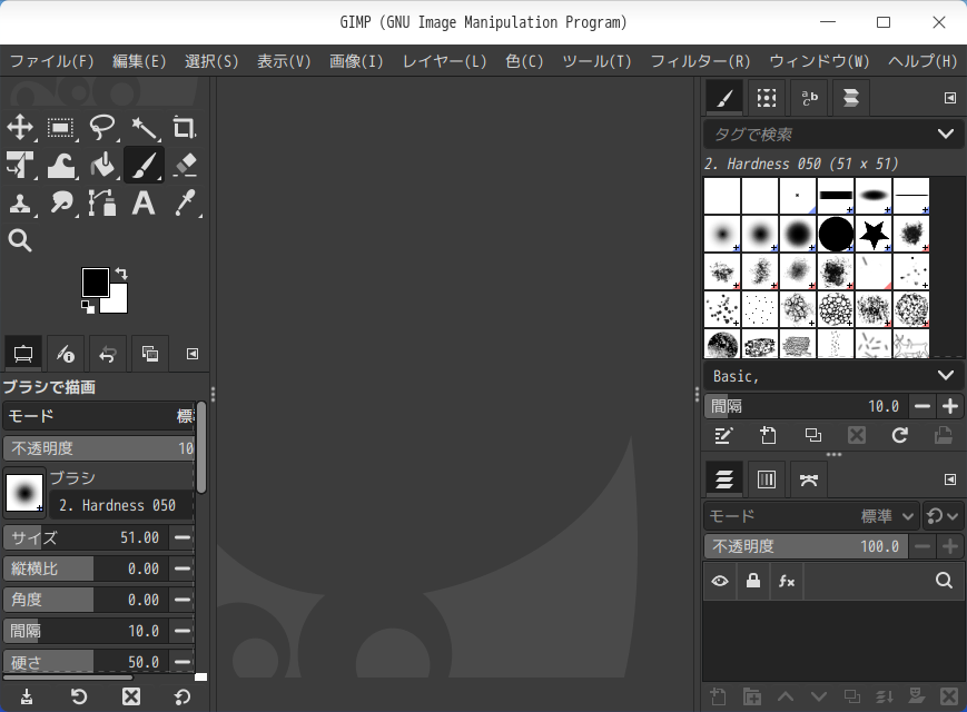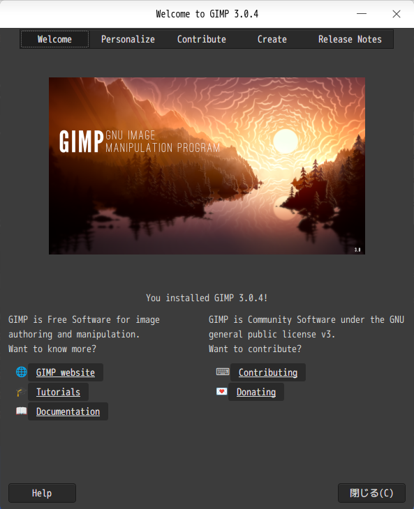 「閉じる」 起動直後の状態です。 2026年4月13日の時点で、下記のバージョンでした。 操作については、「画像編集ソフト - GIMP」に掲載しています。 上記は簡単なものですので、詳細なものがほしい方は、各所に初歩の手引きから応用編までありますので、そちらを参考にしてください。 |