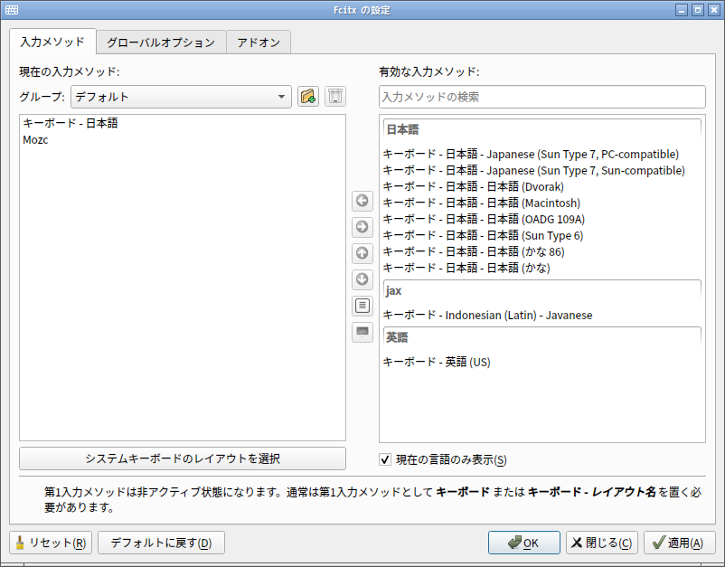 1. 概要 日本語入力として、「fcitx5-mozc」を使用します。 2. インストール 「Synaptic」で「fcitx5」を検索して、「fcitx5-mozc」「fcitx5-config-qt」をインストールします。 インストール後、ログインしなおします。 3. 設定 再ログイン後、バー上のキーボードアイコンを右クリックして「設定」