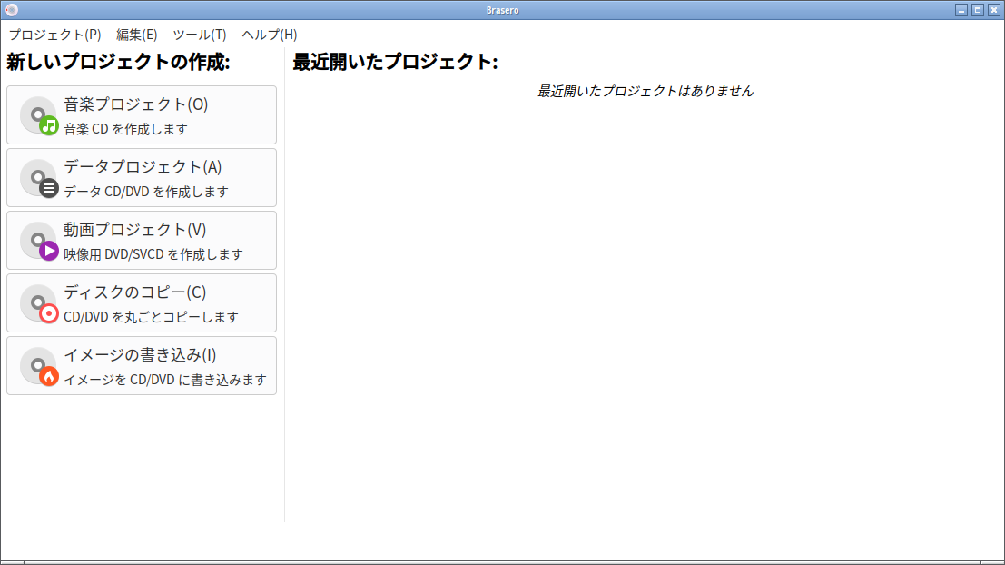 1. 概要 光ディスクライティングソフトとして「Brasero」を使用します。 2. インストール 「Synaptic」で、「brasero」を検索して、インストールします。 3. 起動 「スタート」→「マルチメディア」→ 「Brasero」