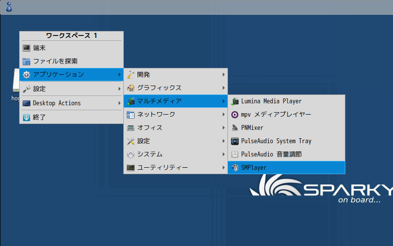 「デスクトップ上右クリック」→「アプリケーション」→「マルチメディア」→「SMPlayer」