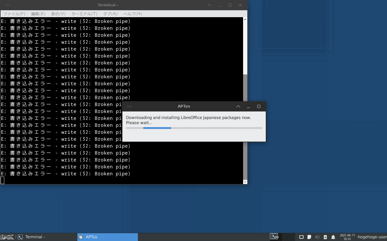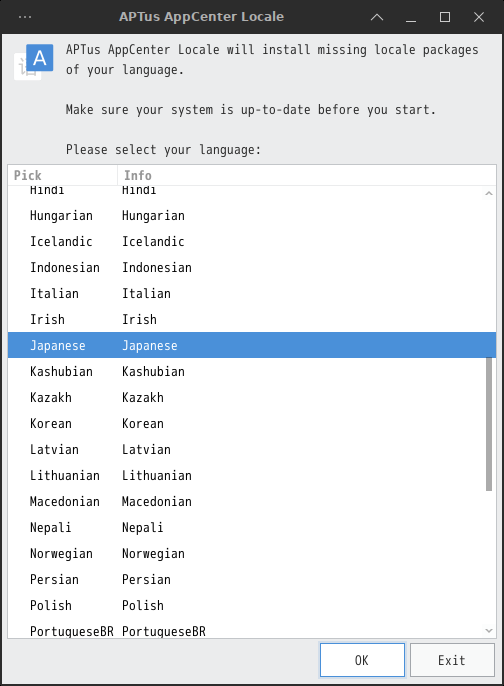 「APTus」が機能しないデスクトップがありますので、「APTus」経由でなく、言語パッケージのインストーラを端末から、直接起動するほうほうと、「APTus」から起動する方法と2つ記述します。