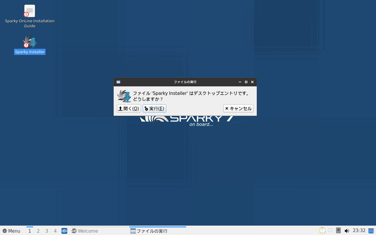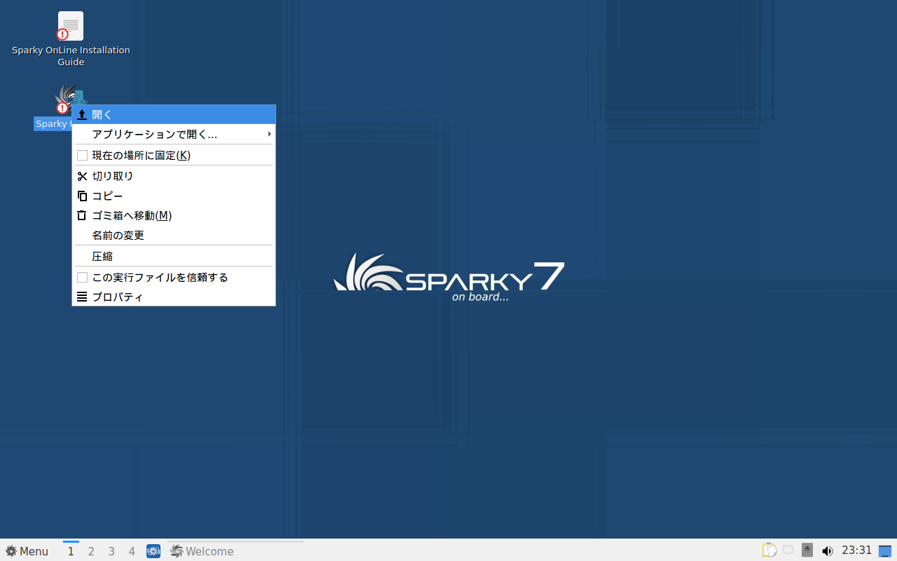 1. 概要 インストールについては、「SparkyLinux - 7.7 - 共通事項」をご参照ください。 2. インストール インストール時のデスクトップで、インストーラを右クリックして 「開く」でインストールを開始します。