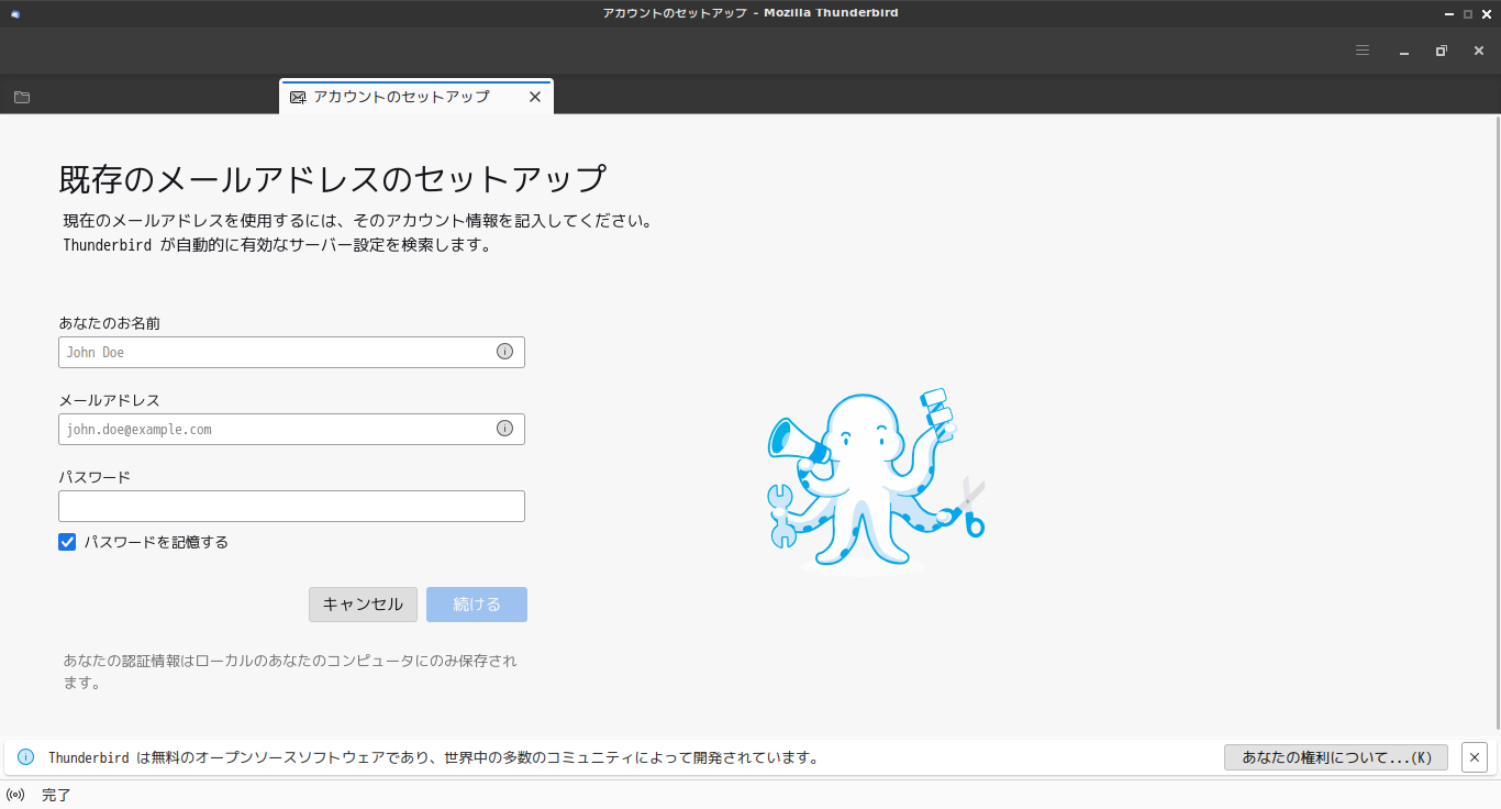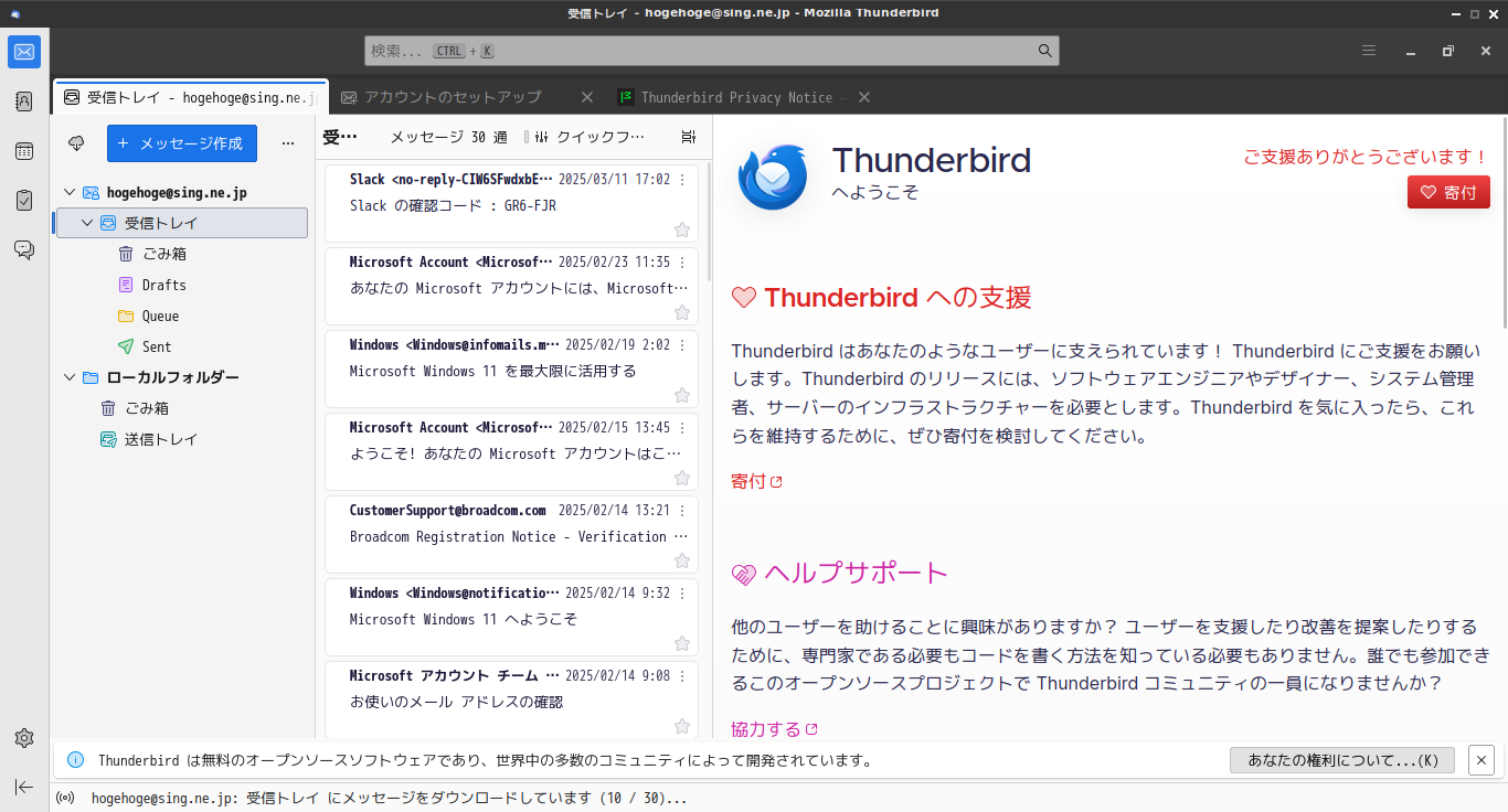 初回起動時は「メールアカウント セットアップ」からはじまります。 起動後に、受信トレイを開いた状態です。 2025年4月14日の時点で、下記のバージョンでした。 「メールアカウン セットアップ」他、操作方法の詳細は「メールクライアント - Thunderbird」でどうぞ。 |