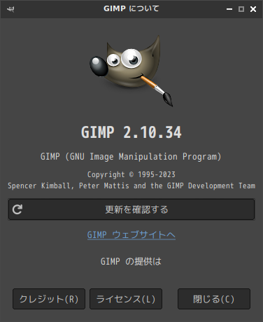 起動直後の状態です。 2025年4月14日の時点で、下記のバージョンでした。 操作については、「画像編集ソフト GIMP2」に掲載しています。 上記は簡単なものですので、詳細なものがほしい方は、各所に初歩の手引きから応用編までありますので、そちらを参考にしてください。 |