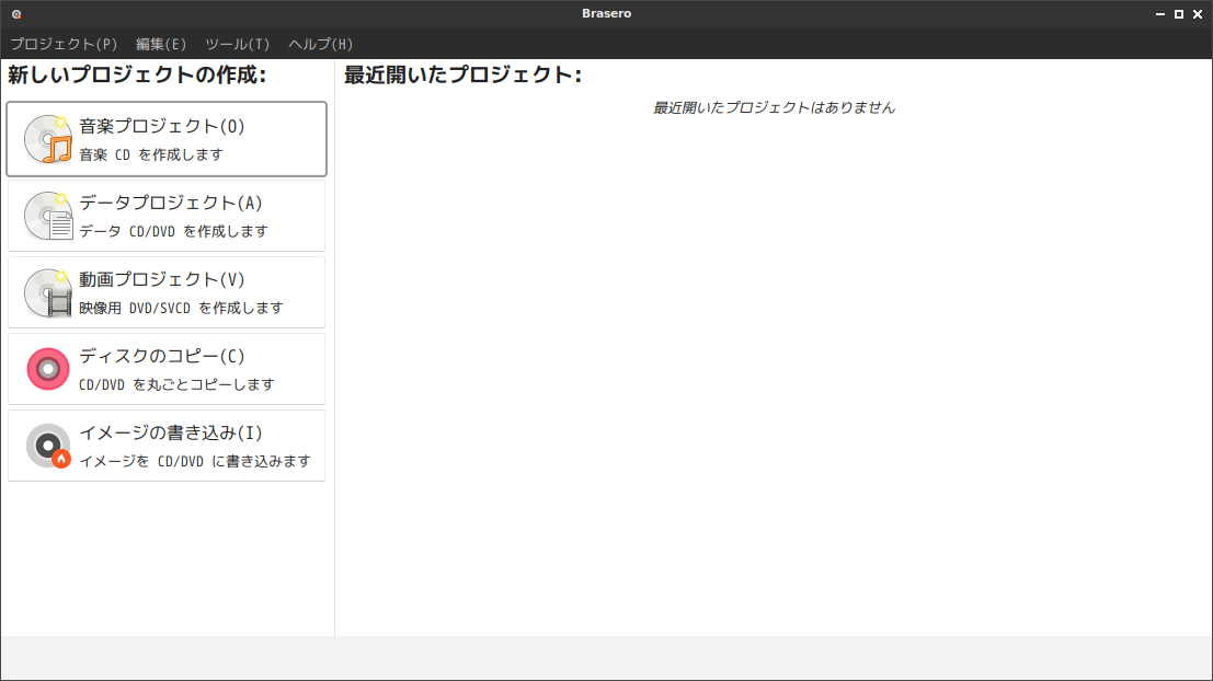 1. 概要 光ディスク(CD・DVD)ライティングソフトとして、「Brasero」を使用します。 2. インストール 「Synaptic」で、「brasero」を検索して、インストールします。 3. 起動 「スタート」→「サウンドとビデオ」→「Brasero」