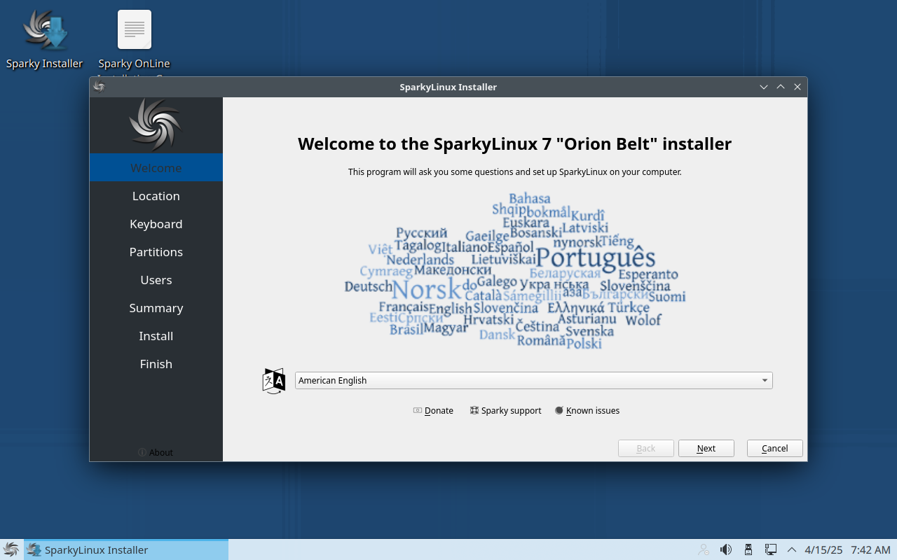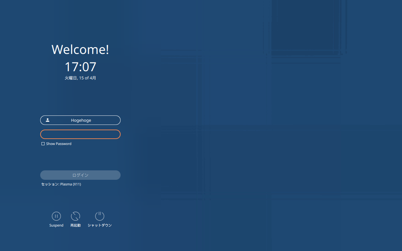 以降は、「SparkyLinux - 7.7 - 共通事項 - インストール」をご参照ください。 ログイン画面が表示されれば、インストールは完了です。 「XFCE」「LXQt」では、ログイン画面が古いものに先祖返りしていましたが、「KDE」は、新しいものが使用されています。 |