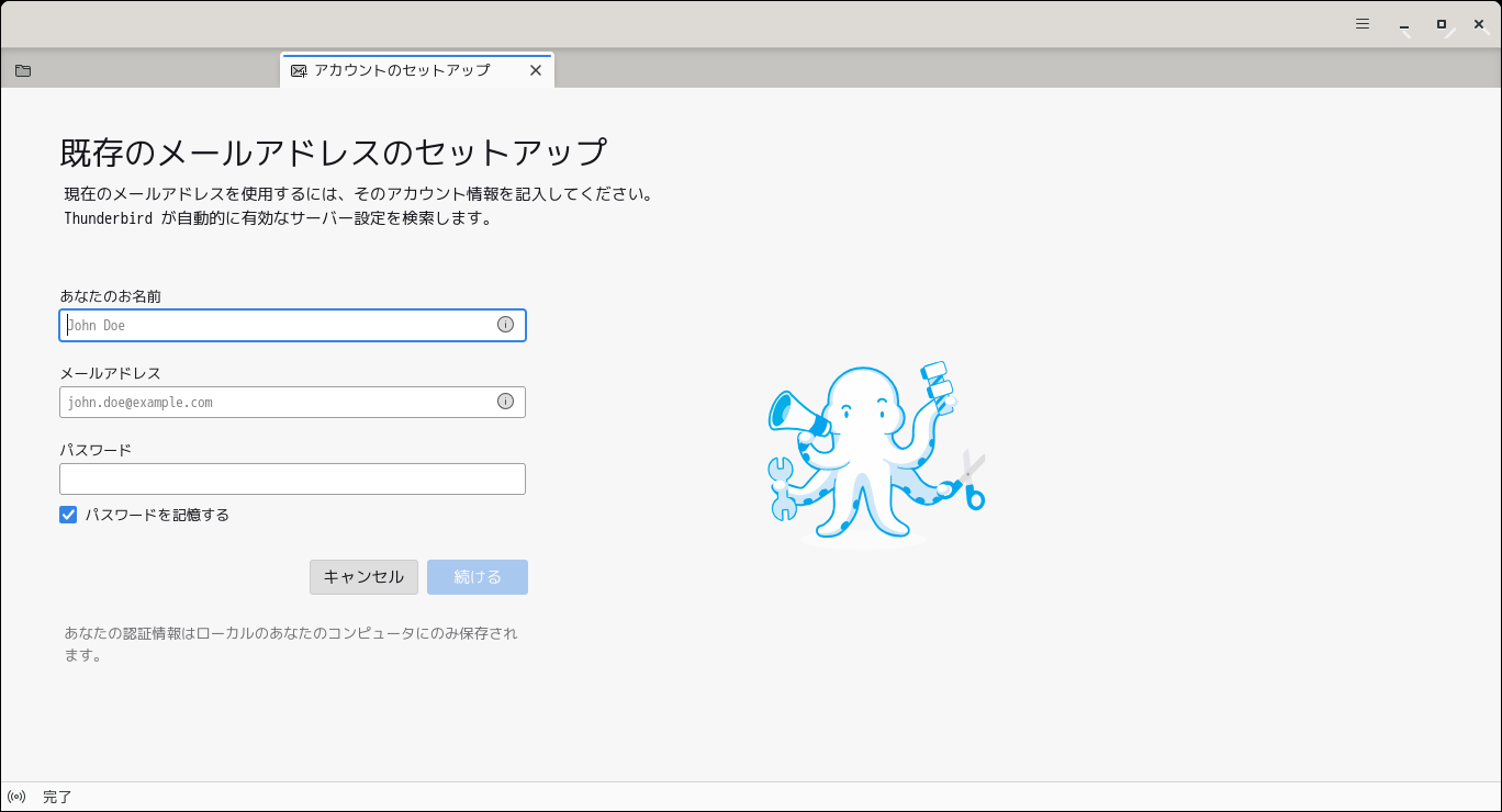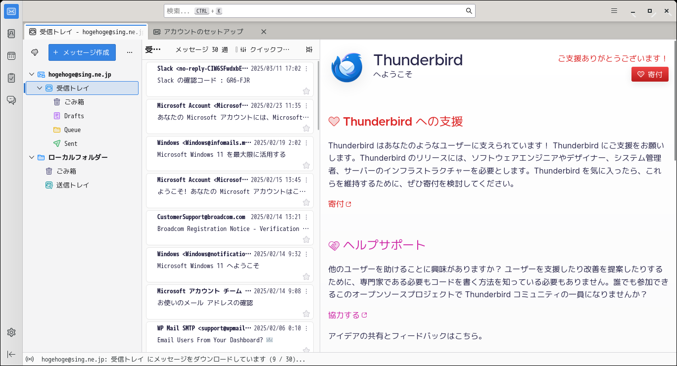 初回起動時は「メールアカウント セットアップ」からはじまります。 起動後に受信トレイを開いた状態です。 2025年4月16日の時点で、下記のバージョンでした。 「メールアカウン セットアップ」他、操作方法の詳細は「メールクライアント - Thunderbird」でどうぞ。 |