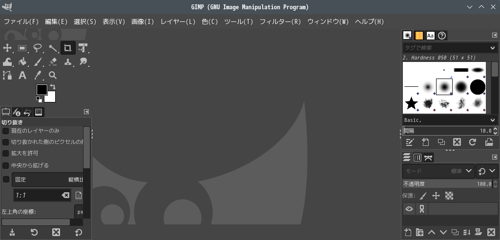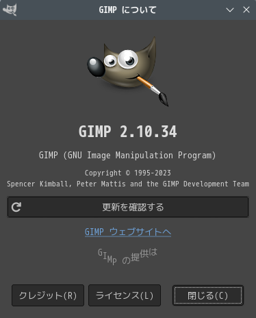 起動直後の状態です。 2025年4月16日の時点で、下記のバージョンでした。 操作については、「画像編集ソフト GIMP2」に掲載しています。 上記は簡単なものですので、詳細なものがほしい方は、各所に初歩の手引きから応用編までありますので、そちらを参考にしてください。 |