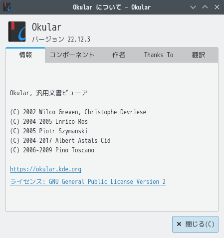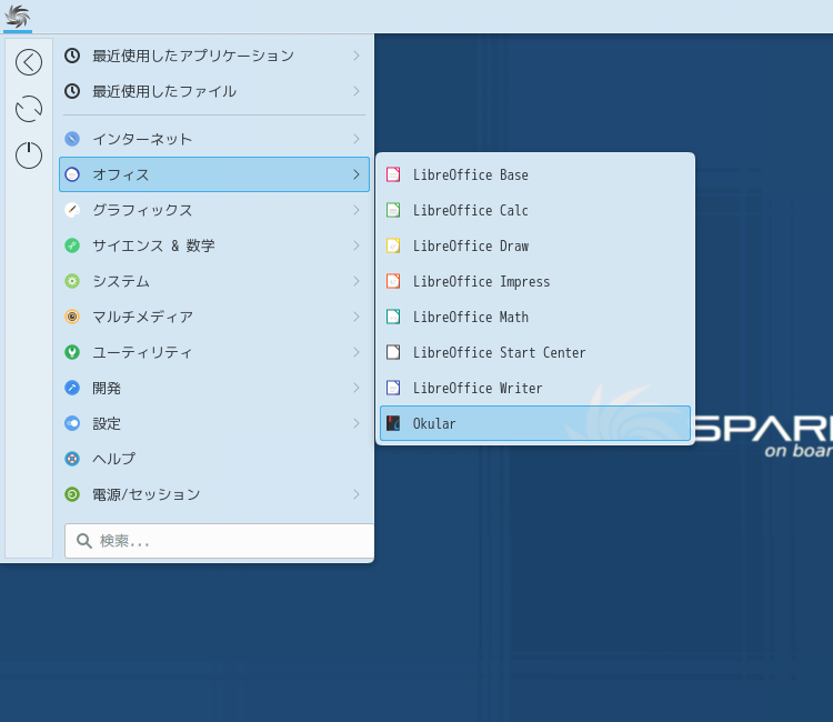 1. 概要 ドキュメントビューアとして、「Okular」を使用します。 「Okular」は、デフォルトでインストールされています。 言語パッケージをインストールした時点で、日本語化されます。 言語パッケージのインストールに関しては、「Linux - SparkyLinux - 7.7 - 共通事項」をご参照ください。 2. 起動 「スタート」→「オフィス」→「Okular」