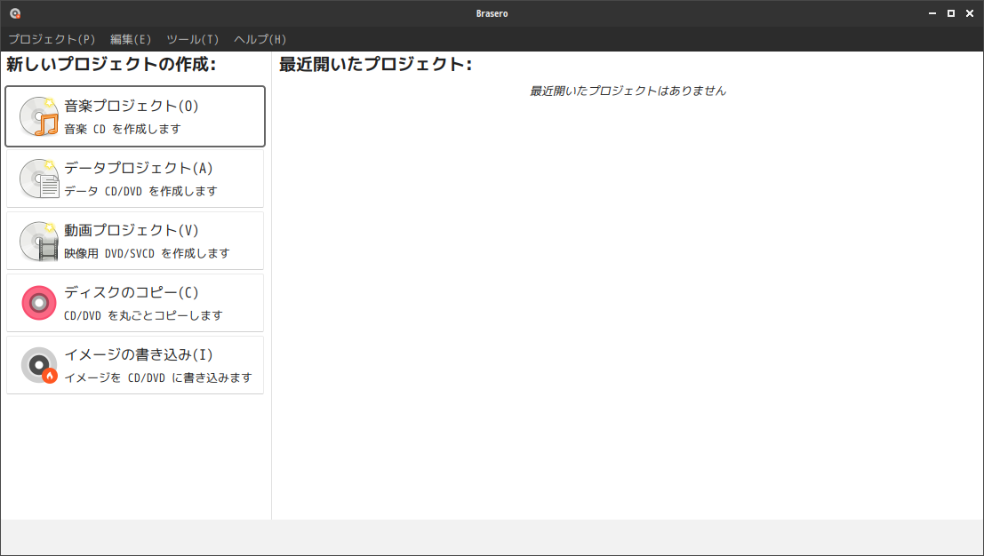 1. 概要 光ディスク(CD・DVD)ライティングソフトとして、「Brasero」を使用します。 2. インストール 「Synaptic」で、「brasero」を検索して、インストールします。 3. 起動 「スタート」→「マルチメディア」→「Brasero」