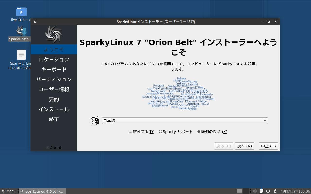 以降は、「SparkyLinux - 7.7 - 共通事項 - インストール」をご参照ください。