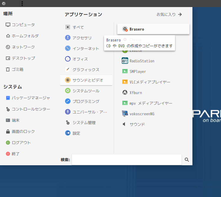 1. 概要 光ディスク(CD・DVD)ライティングソフトとして、「Brasero」を使用します。 2. インストール 「Synaptic」で、「brasero」を検索してインストールします。 3. 起動 「スタート」→「マルチメディア」→「Brasero」