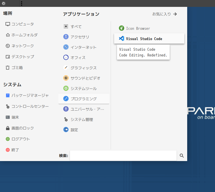 1. 概要 開発環境として、「Visual Studio Code」を使用します。 2. インストール 「APTus」でインストールします。 インストール手順の詳細や操作については、「Visual Studio Code - インストール・更新」をご参照ください。 3. 起動 「スタート」→「開発」→「Visual Studio Code」