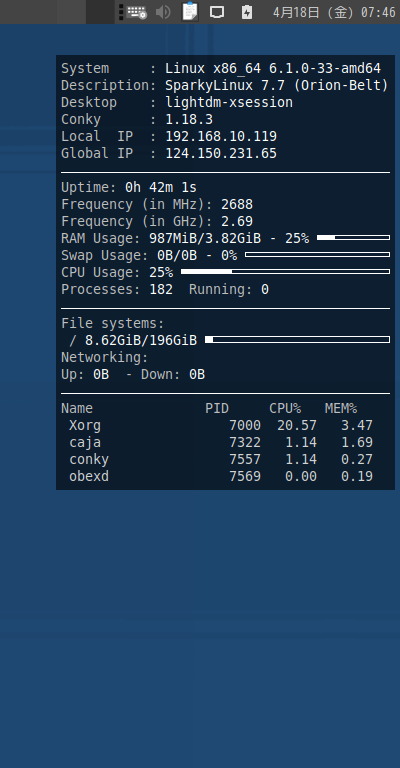 再ログイン後、デスクトップ右に、「Conky」の表示が現れます。