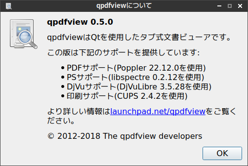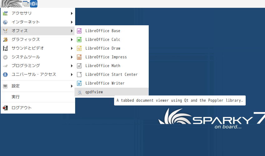 1. 概要 ドキュメントビューアとして、「qpdfview」を使用します。 「LXDE」を「Openbox」上にインストールしていますが、「qpdfview」は、「Openbox」にデフォルトでインストールされています。 言語パッケージをインストールした時点で、日本語化されます。 言語パッケージのインストールに関しては、「Linux - SparkyLinux - 7.7 - 共通事項」をご参照ください。 「.pdf」以外のファイルが見られるかは、存じません。 2. 起動 「スタート」→「オフィス」→「qpdfview」→「qpdfview」