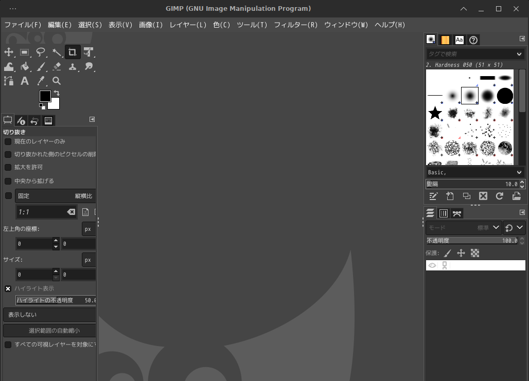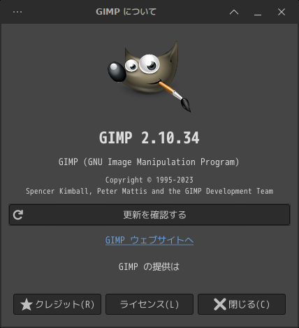 起動直後の状態です。 2025年7月16日の時点で、下記のバージョンでした。 操作については、「画像編集ソフト GIMP2」に掲載しています。 上記は簡単なものですので、詳細なものがほしい方は、各所に初歩の手引きから応用編までありますので、そちらを参考にしてください。 |