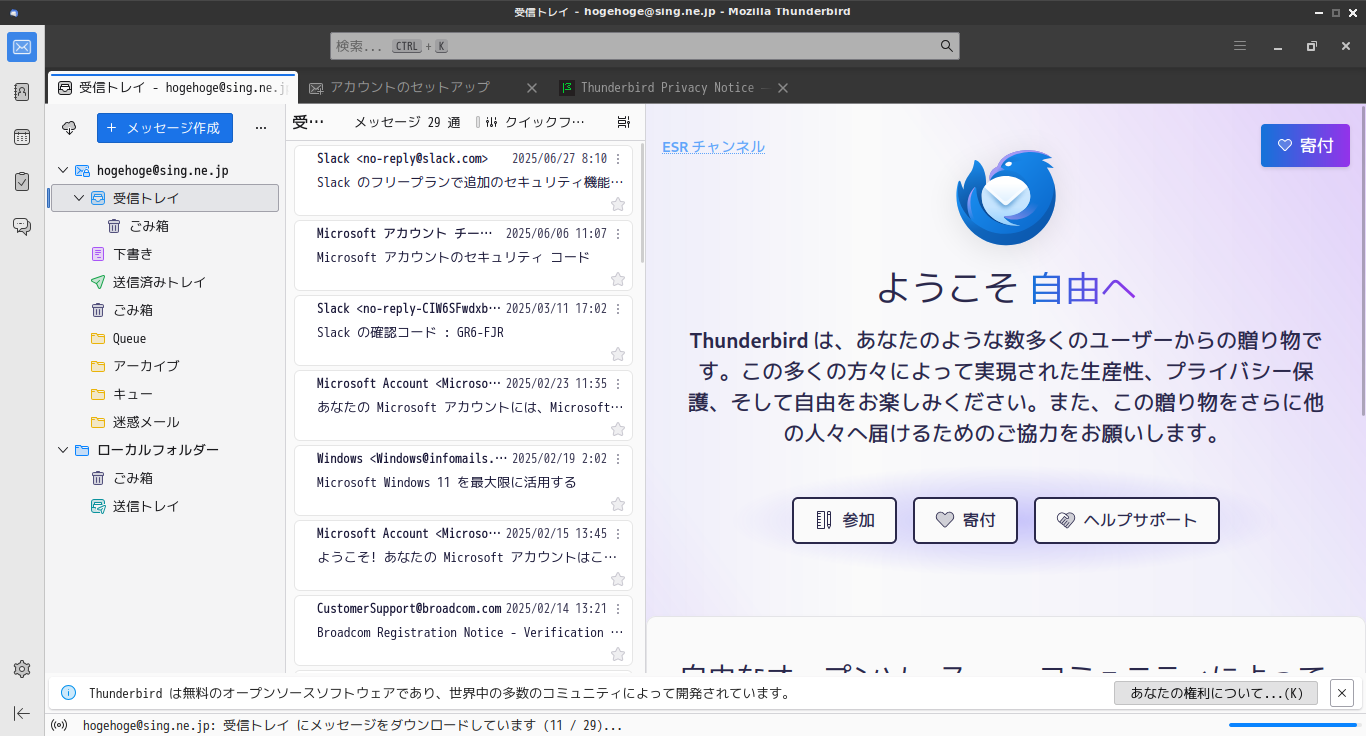 初回起動時は「メールアカウント セットアップ」からはじまります。 起動後に、受信トレイを開いた状態です。 2025年7月18日の時点で、下記のバージョンでした。 「メールアカウン セットアップ」他、操作方法の詳細は「メールクライアント - Thunderbird」でどうぞ。 |
