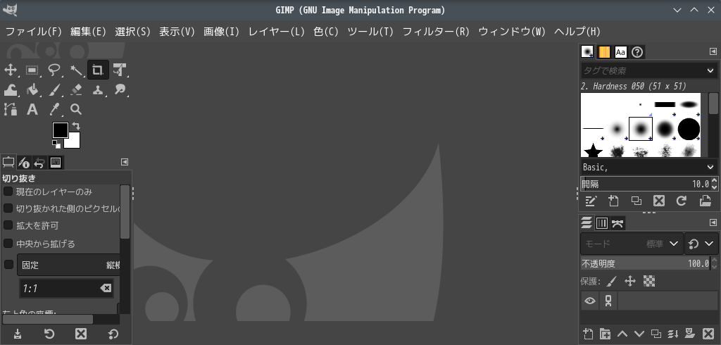 起動直後の状態です。 2025年7月18日の時点で、下記のバージョンでした。 操作については、「画像編集ソフト GIMP2」に掲載しています。 上記は簡単なものですので、詳細なものがほしい方は、各所に初歩の手引きから応用編までありますので、そちらを参考にしてください。 |