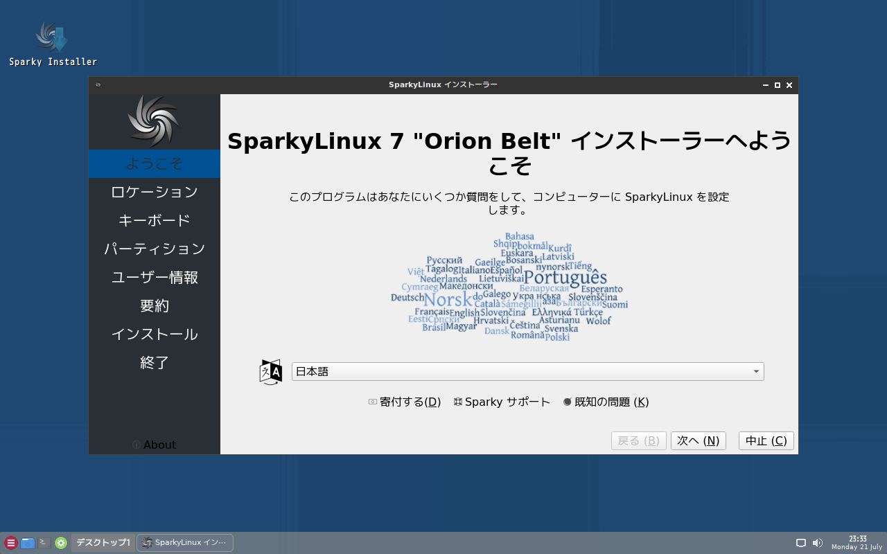 以降は、「SparkyLinux - 7.8 - 共通事項 - インストール」をご参照ください。