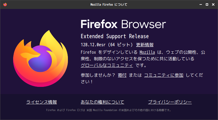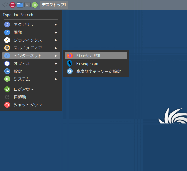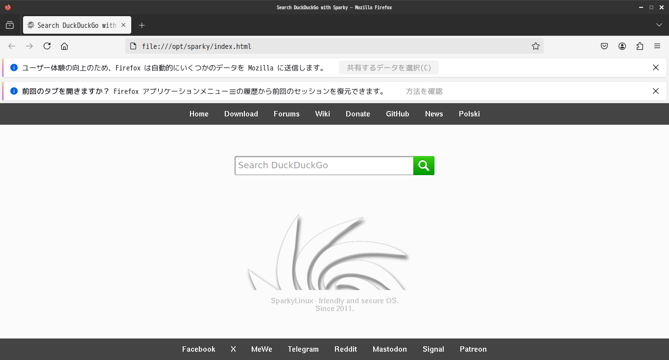 1. 概要 ブラウザは、デフォルトで「Firefox」がインストールされています。 言語パッケージをインストールした時点で、日本語化されます。 言語パッケージのインストールに関しては、「Linux - SparkyLinux - 7.8 - 共通事項」をご参照ください。 2. 起動 「スタート」→「インターネット」→「Firefox」