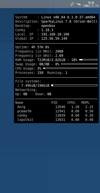 ログイン後に、デスクトップ右に、「Conky」の表示が現れます。