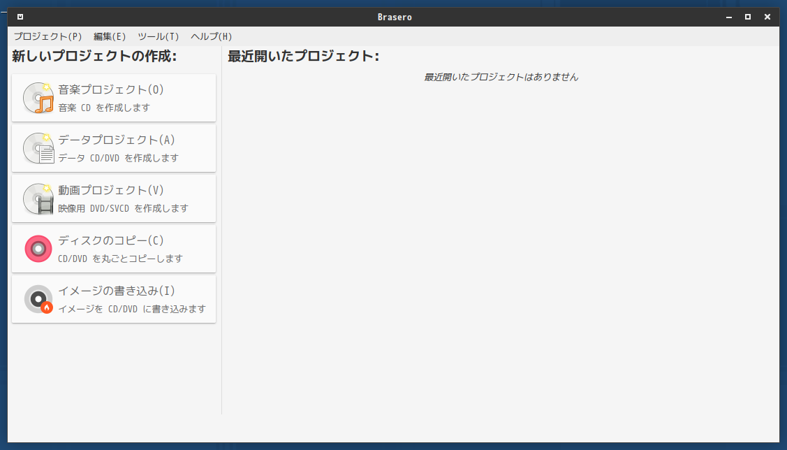 1. 概要 光ディスク(CD・DVD)ライティングソフトとして、「Brasero」を使用します。 2. インストール 「Synaptic」で、「brasero」を検索してインストールします。 3. 起動 「スタート」→「マルチメディア」→「Brasero」