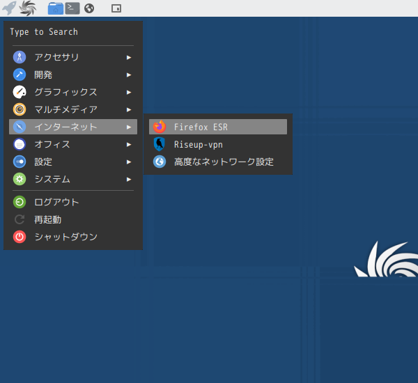 1. 概要 ブラウザとして、「Firefox」がデフォルトでインストールされています。 言語パッケージをインストールした時点で、日本語化されます。 言語パッケージのインストールに関しては、「Linux - SparkyLinux - 7.8 - 共通事項」をご参照ください。 2. 起動 「スタート」→「インターネット」→「Firefox」